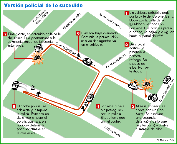 Aquel día, el negro Fonseca, paseaba tranquilamente por la calle De La Igualdad cuando fue reducido por las fuerzas del orden. Lejos de amedrantarse ante lo significativo de aquella calle, la policía lo metió en un portal y se produjo una refriega de la que no tenemos conocimiento. Fonseca -suponemos- trataría de explicarse; argumentaría que él era un ciudadano con residencia legal en España, sacaría a relucir la Carta Magna, la Declaración de los Derechos del Hombre y todas las demás igualdades que nos asisten en un Estado democrático. Pero al parecer Fonseca no resultó convincente y por eso al zafarse de los guardias huyó calle abajo. Acosado por sus captores tuvo la mala fortuna de iniciar la huida por la calle De la Porra. Sin duda, aquel no era un buen sitio para huir estando bajo la amenazadora sombra de los agentes y del peso de aquella inquietante calle. Por eso Fonseca decidió recortar su carrera y desandar de nuevo los pasos. Un hombre como él, acostumbrado a dar explicaciones hasta por su sola presencia en el mundo, estaba mejor dotado que sus perseguidores, así que reinició la huida por la calle De La Igualdad. Pero evidentemente Fonseca nunca fue un hombre afortunado, porque al llegar a la Avenida de lo que él creía era la Gran Avenida de la Libertad, giró a la izquierda en una vieja y angosta calle: la Del 18 de Julio. No sabemos lo que le hubiera deparado el futuro si al llegar a esa calle hubiera girado a la derecha, pero en su alocada carrera Fonseca, agobiado, exhausto e imprudente tuvo la osadía de girar a la izquierda en aquel oscuro callejón del pasado. Si al menos el hostigamiento hubiera tenido lugar en París, durante el 18 del Brumario, tal vez hubiera tenido alguna oportunidad, pero no, sucedió en Canarias, en verano, casi al final del segundo milenio, durante la mayor oleada de inmigrantes registrada en la Historia, en la calle Del 18 de Julio. Era, por tanto, éste, un final previsible.