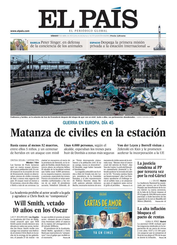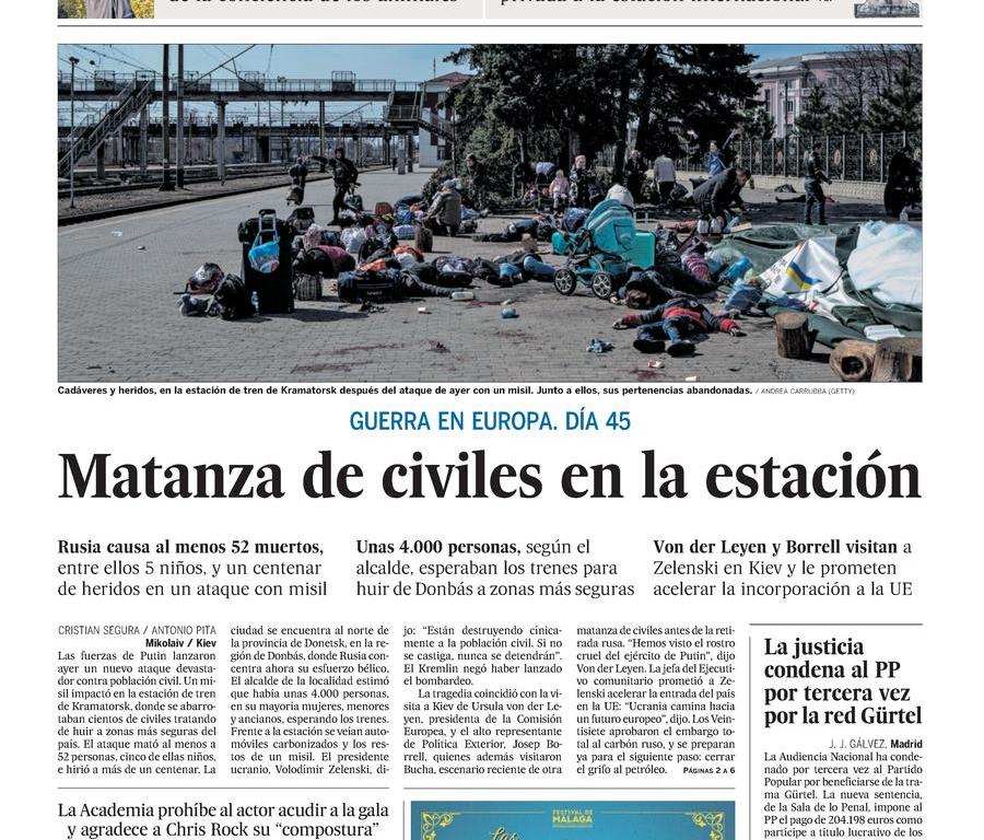 Esta primavera que ha sido saqueada por el invierno sigue trayendo las inclemencias del Este a todos los rincones de Ucrania. Ayer una tormenta estalló sobre la estación de tren de Kramatorsk y trajo el horror del cielo. Un horror silencioso, distinto al lodazal de gritos, sangre y polvo al que no quiero de ninguna manera acostumbrarme. Sin embargo, en la fotografía de portada de ayer de El País hay algo desconcertante y si no fuera por los cadáveres que certifican la existencia del horror parece que la guerra hubiera alcanzado un nuevo estadio en la consecución de la muerte. He consultado algunas otras fuentes y en todos los demás periódicos se percibe el mismo desconcierto. Lo peor es que la imagen no es la de un grupo de pasajeros que aburridos por un retraso injustificable decidieran echarse en el suelo de la sala de espera de alguna estación hasta que por megafonía les informen de su partida. Pero en realidad son cadáveres que ya no viajarán a ningún otro sitio y su muerte, ajena al polvo y la escombrera, seguirá siendo injusta, dolorosa y gratuita. Sigo echando en falta a algún Jefe de Estación que rompa el silencio y avise a tiempo a otros viajeros, como en el poema de Iryna Vikyrchak: “Los copos de nieve son lágrimas congeladas/traídas por las nubes desde lejanas tierras/Cada pequeña gota contiene su propia historia trágica/una guerra, una calamidad…”